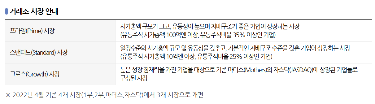- 프라임 시장: 대규모 기업이 상장되어 있으며, 유동성과 지배구조가 우수한 기업들이 포함됩니다