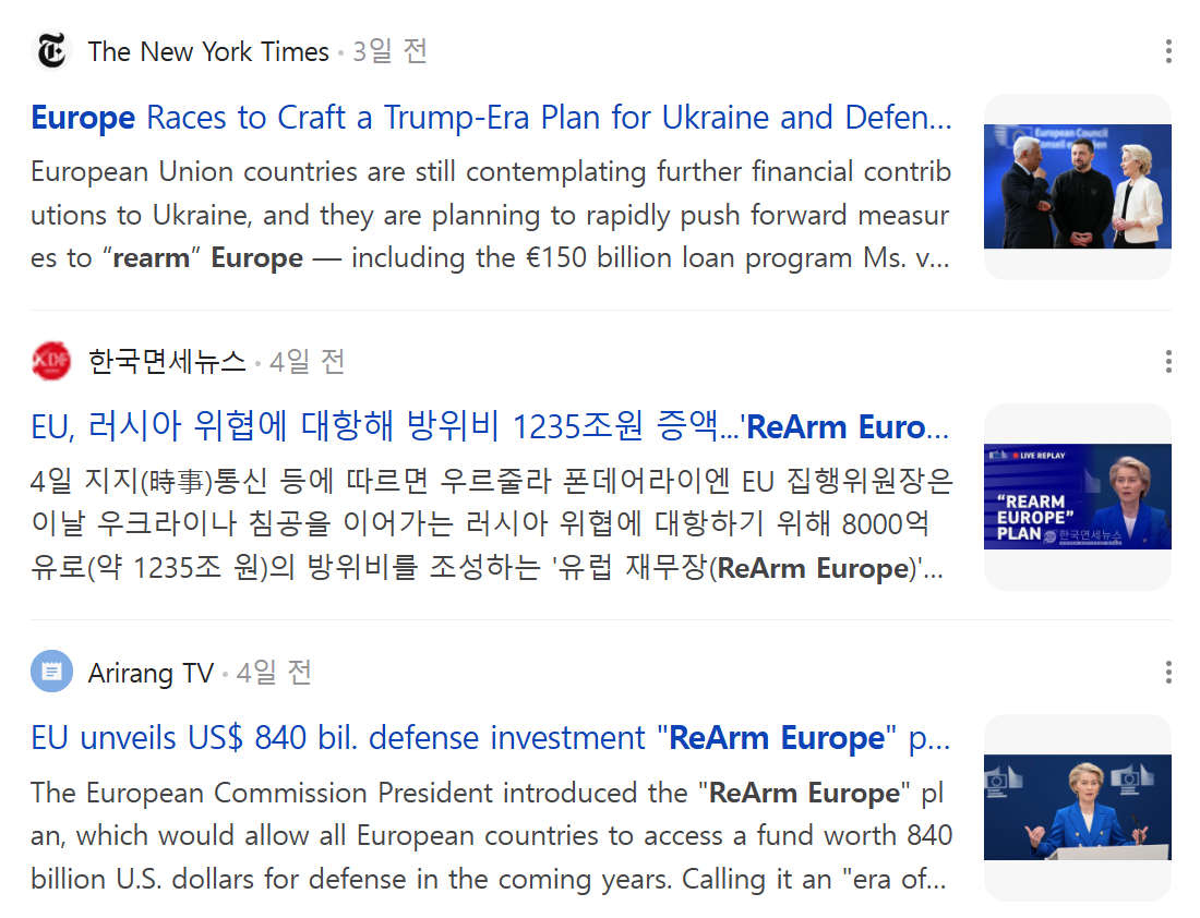 2025년 3월, 우르줄라 폰데어라이엔 EU 집행위원장은 '유럽 재무장 계획(ReArm Europe)'을 공식 발표했습니다