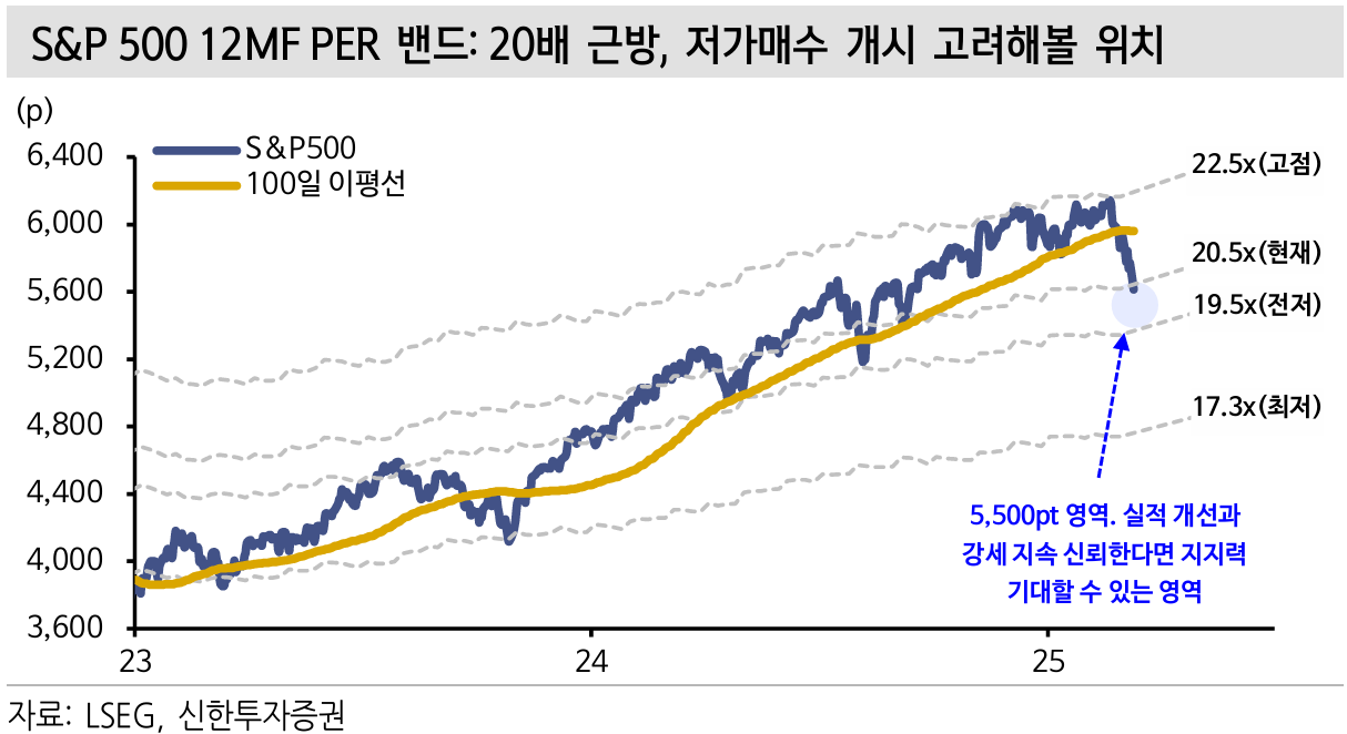 신한투자증권은 S&P 500 지수의 5,500 포인트 부근(PER 20배에 해당)을 첫 번째 저가 매수 지점으로 제시합니다. 현재 시장에서 급격한 V자 반등을 기대하기는 어렵지만, 기업들의 실적 개선이 계속된다면 이 수준은 매수 기회가 될 수 있습니다