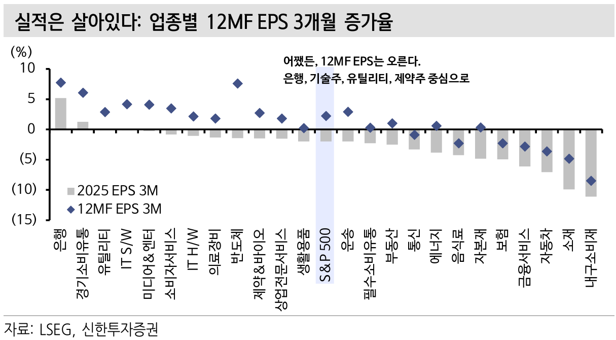 업종별 12MF EPS(향후 12개월 예상 주당순이익) 증가율을 살펴보면, 대부분의 섹터에서 실적 개선이 이어지고 있습니다. 이는 시장의 펀더멘털이 여전히 강하다는 신호입니다