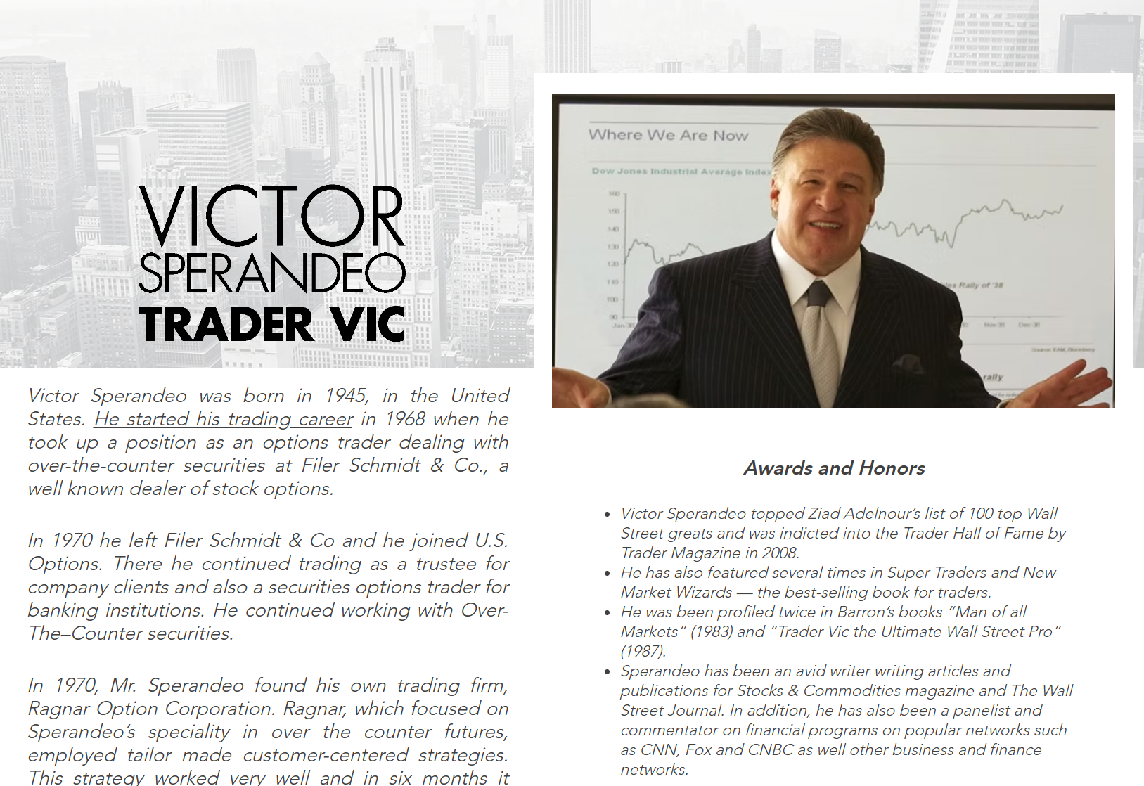 빅터 스페란데오, 일명 "트레이더 빅(Trader Vic)"은 45년 이상의 성공적인 투자 경력을 자랑하는 월스트리트의 전설적인 트레이더입니다. 그의 투자 철학과 전략은 많은 투자자들에게 영감을 주고 있습니다