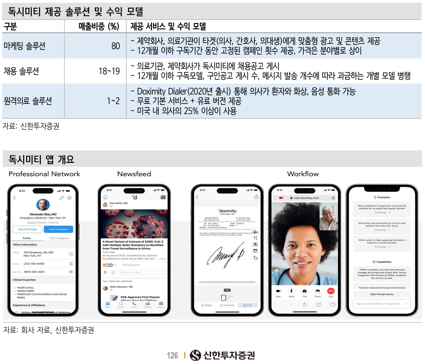 - 원격의료 솔루션 (매출 비중 1~2%): Doximity Dialer를 통해 의사가 환자와 화상, 음성 통화 가능