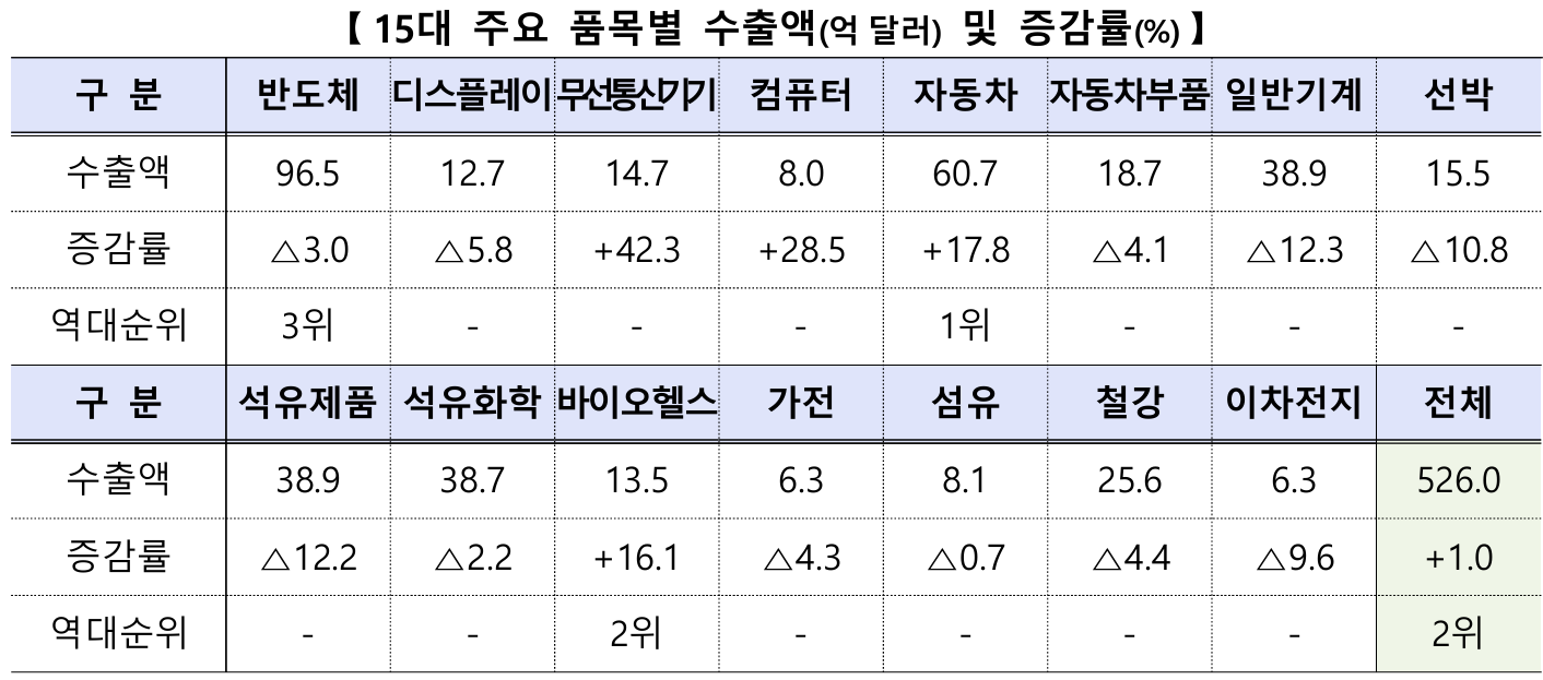 반도체 수출은 전년 대비 3.0% 감소한 96억 달러를 기록했습니다. 그러나 고부가가치 제품인 HBM(고대역폭 메모리)과 DDR5(최신 메모리) 등은 여전히 좋은 실적을 보였어요