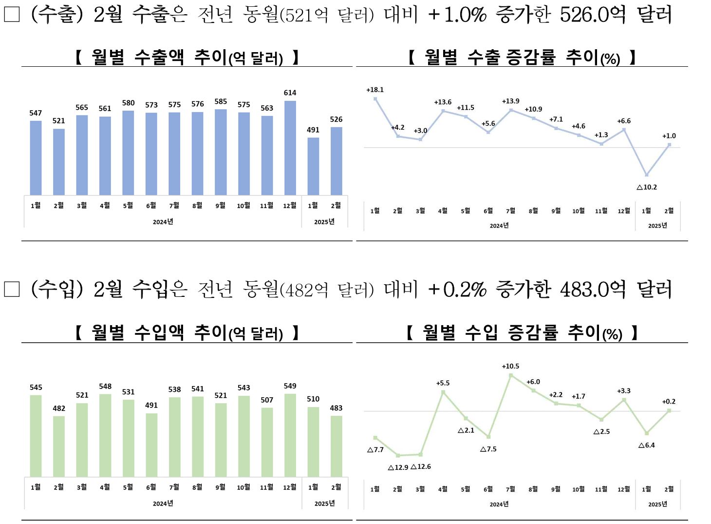 2025년 2월, 한국의 수출은 지난해 같은 달보다 1.0% 증가한 526억 달러를 기록했습니다