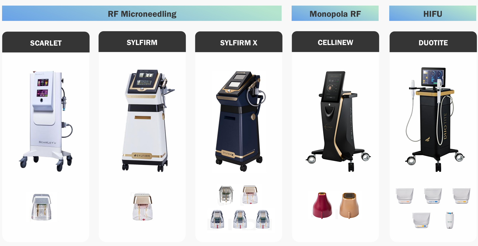 - 듀오타이트: 초음파(HIFU) 기술을 활용한 신제품으로 주름 개선, 피부 탄력 증대, 체형 관리에 효과적
