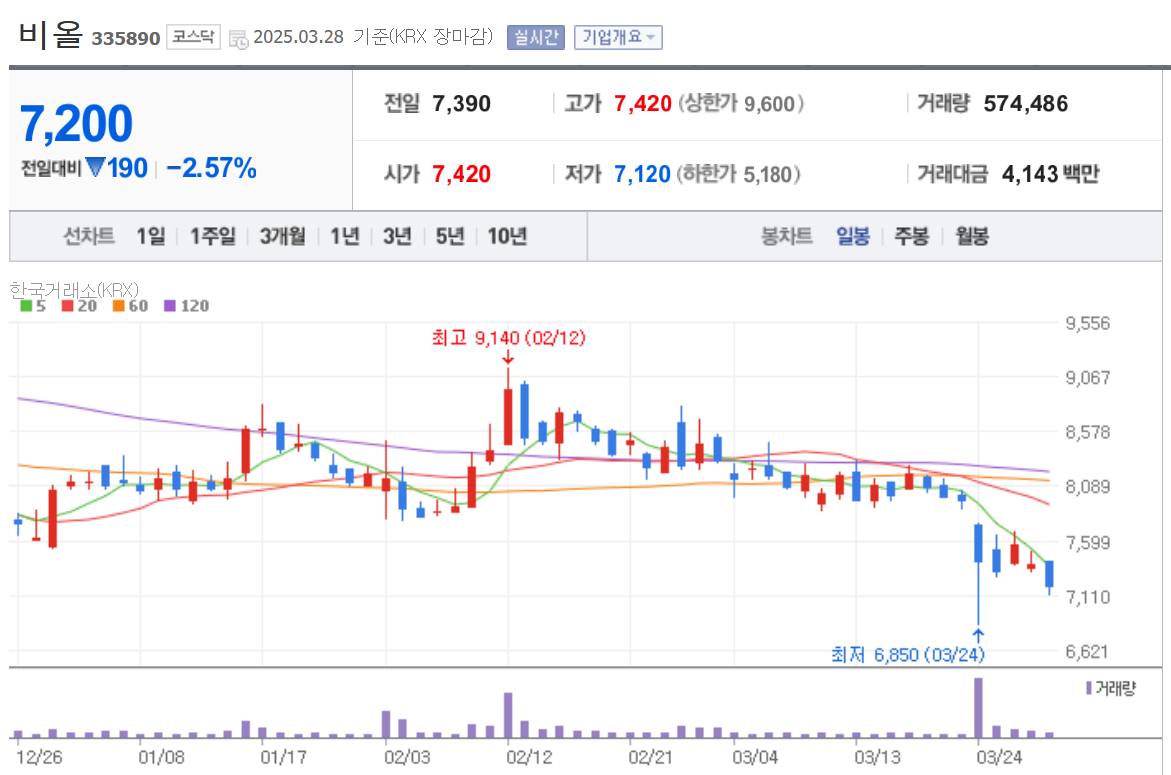 DMS의 상장폐지 우려는 단기적으로 주가에 상당한 부담으로 작용하고 있으나, 비올의 자체 사업 모델과 실적은 견조하게 유지되고 있습니다. 주가는 2025년 3월 26일 기준 6.78% 하락하며 7,420원에 거래되었습니다