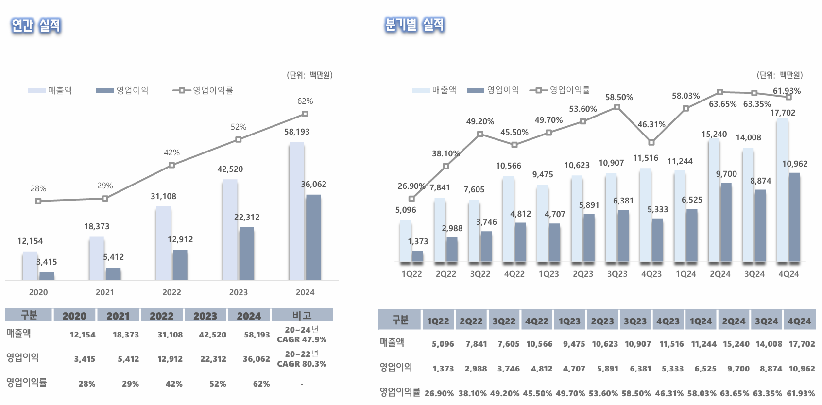 - 영업이익률 62%(2024년): 매우 높은 수익성의 비즈니스 모델