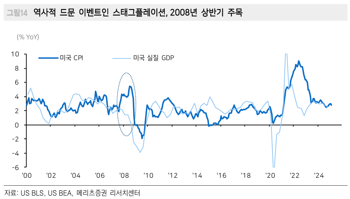가장 최근 스태그플레이션과 유사했던 시기는 2008년 금융위기 직전으로, 당시 미국 CPI는 5% 대로 상승했으며 성장률은 1% 대로 하락했습니다