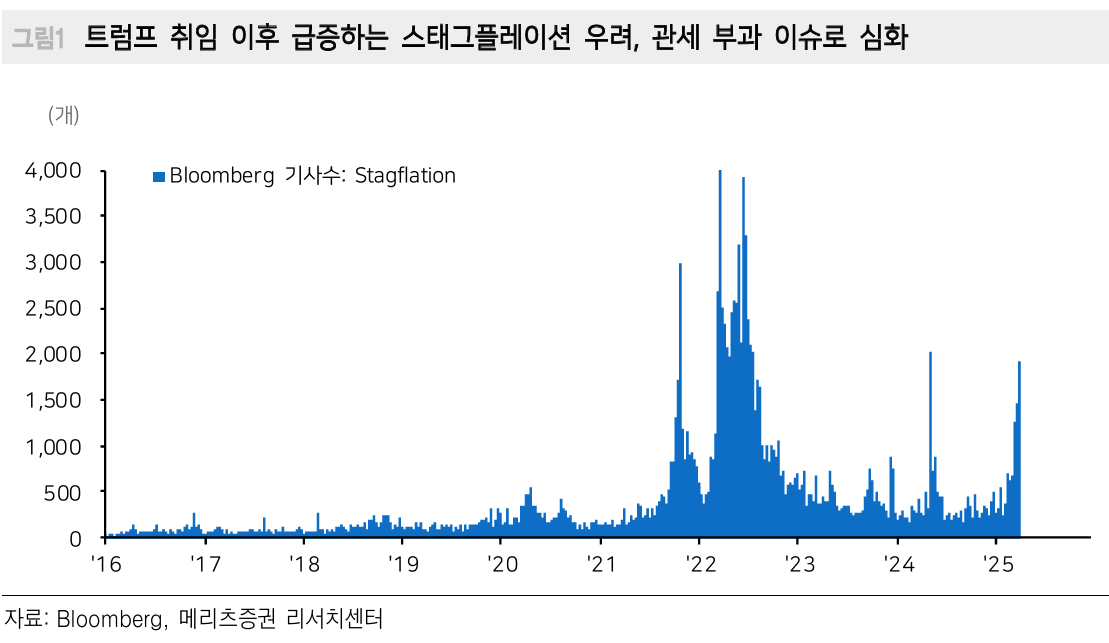 이로 인해 스태그플레이션 뉴스가 급증했지만, 파월 의장은 "스태그플레이션에 동의하지 않는다"고 언급하면서도 "관세 부과에 따른 물가 불확실성이 높다"는 점을 인정했습니다