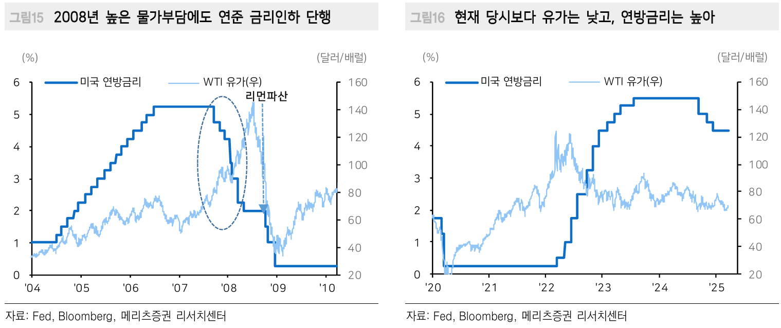 그러나 현재는 2008년과 달리 미국 연방금리가 훨씬 높고 유가는 훨씬 낮은 상황입니다. 또한 연방준비제도는 당시 리먼브라더스 파산 훨씬 이전인 2007년 9월부터 이미 금리인하를 시작했다는 점도 주목할 만합니다