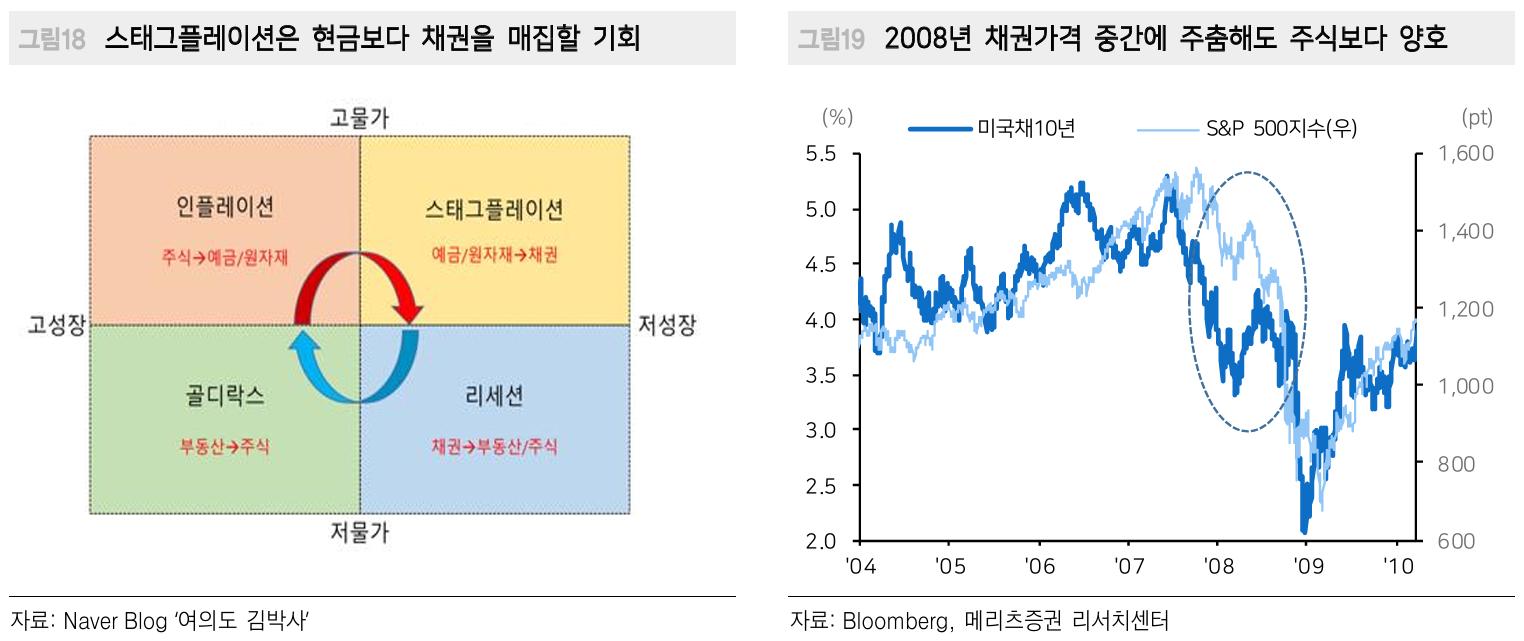 버핏의 투자시계 관점에서, 물가부담이 높으면서 경기둔화 압력이 커지는 현재와 같은 국면에서는 채권 매집이 유리합니다. 불확실성 속에서 안전자산을 통한 위험관리가 중요해지는 시점입니다