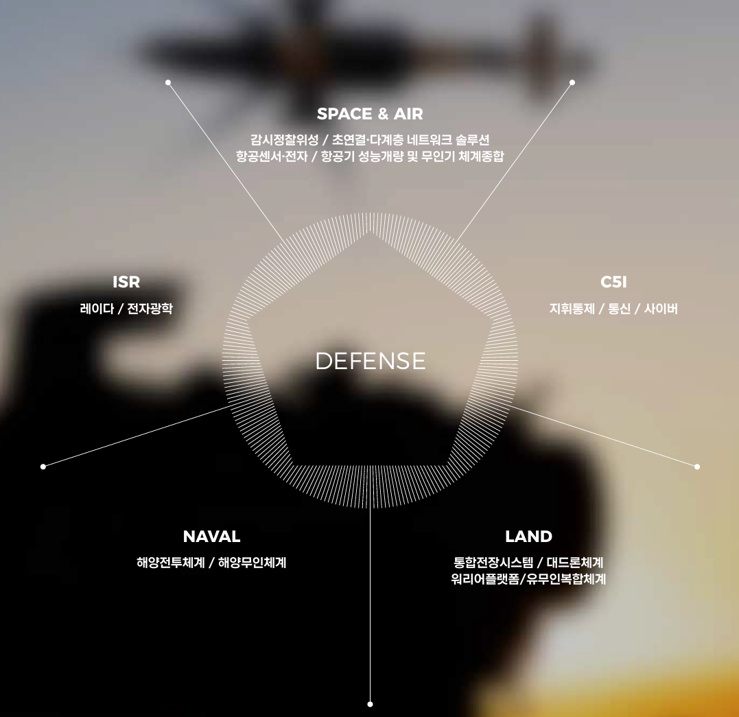 - ISR(Intelligence, Surveillance, and Reconnaissance): 레이더 및 전자 광학 시스템 등 감시정찰 장비 개발 및 생산(2018년 방산 매출의 41%)