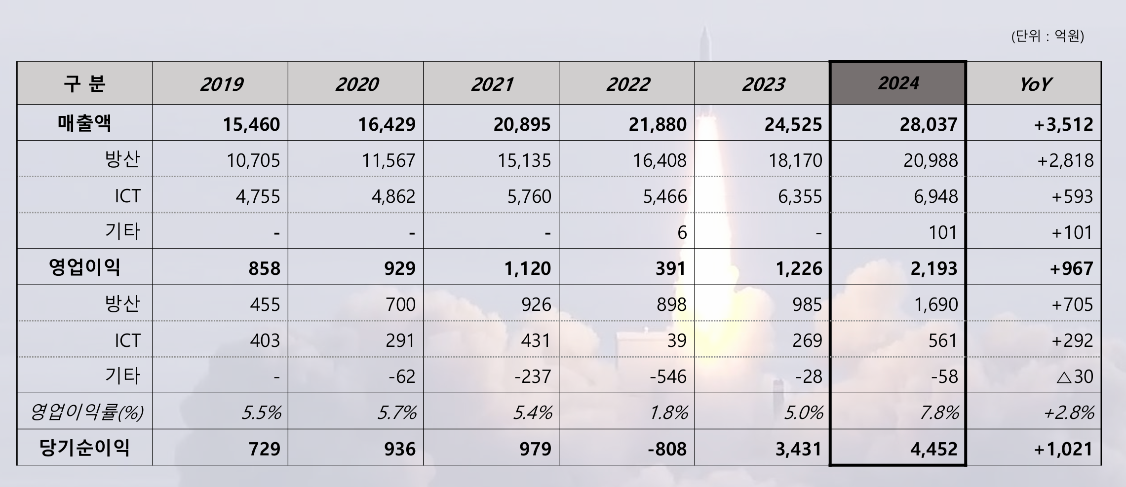 한화시스템은 2024년에 매출과 영업이익 모두 큰 폭으로 성장했으며, 특히 영업이익률이 7.8%로 개선되어 수익성이 강화되었습니다. 방산 부문의 수출 확대와 국내 양산 사업 증가, ICT 부문의 안정적 성장이 실적 개선의 주요 동력이 되었습니다