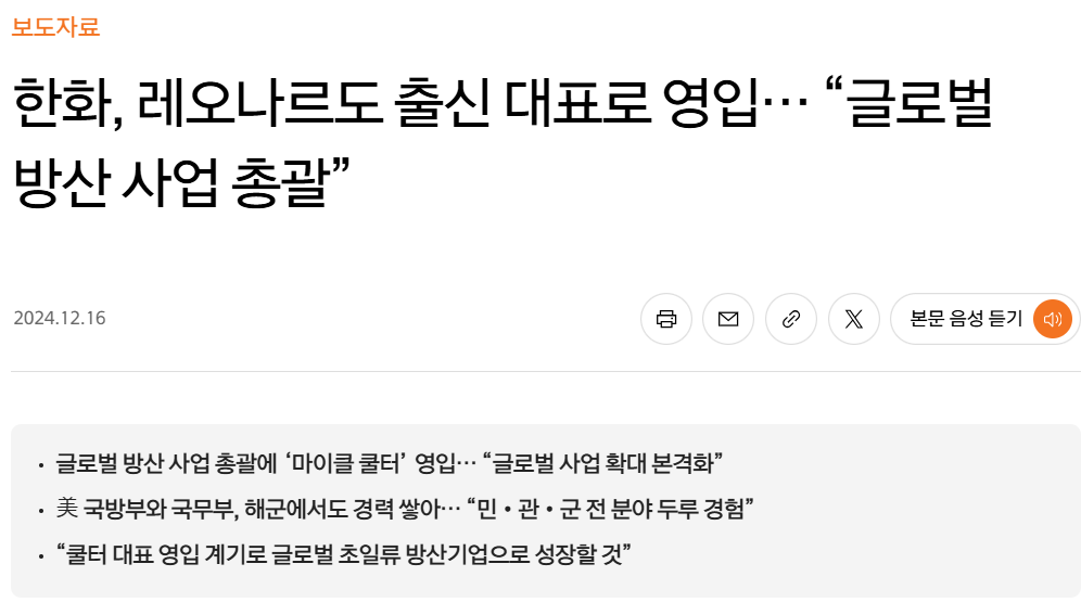 - 글로벌 방산 사업부 책임자인 마이클 컬터(Michael Coulter)는 미국, 유럽, 중동, 아시아 전역에 걸친 공격적인 확장 전략을 추진하고 있습니다