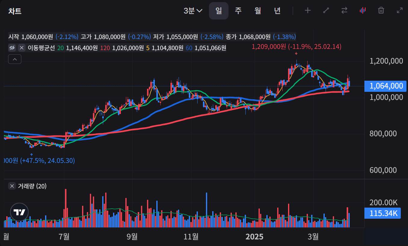 - 단기 추세(최근 2개월): 2025년 2월 14일 기록한 1,209,000원 고점 대비 약 11.9% 하락한 상태로 조정 국면