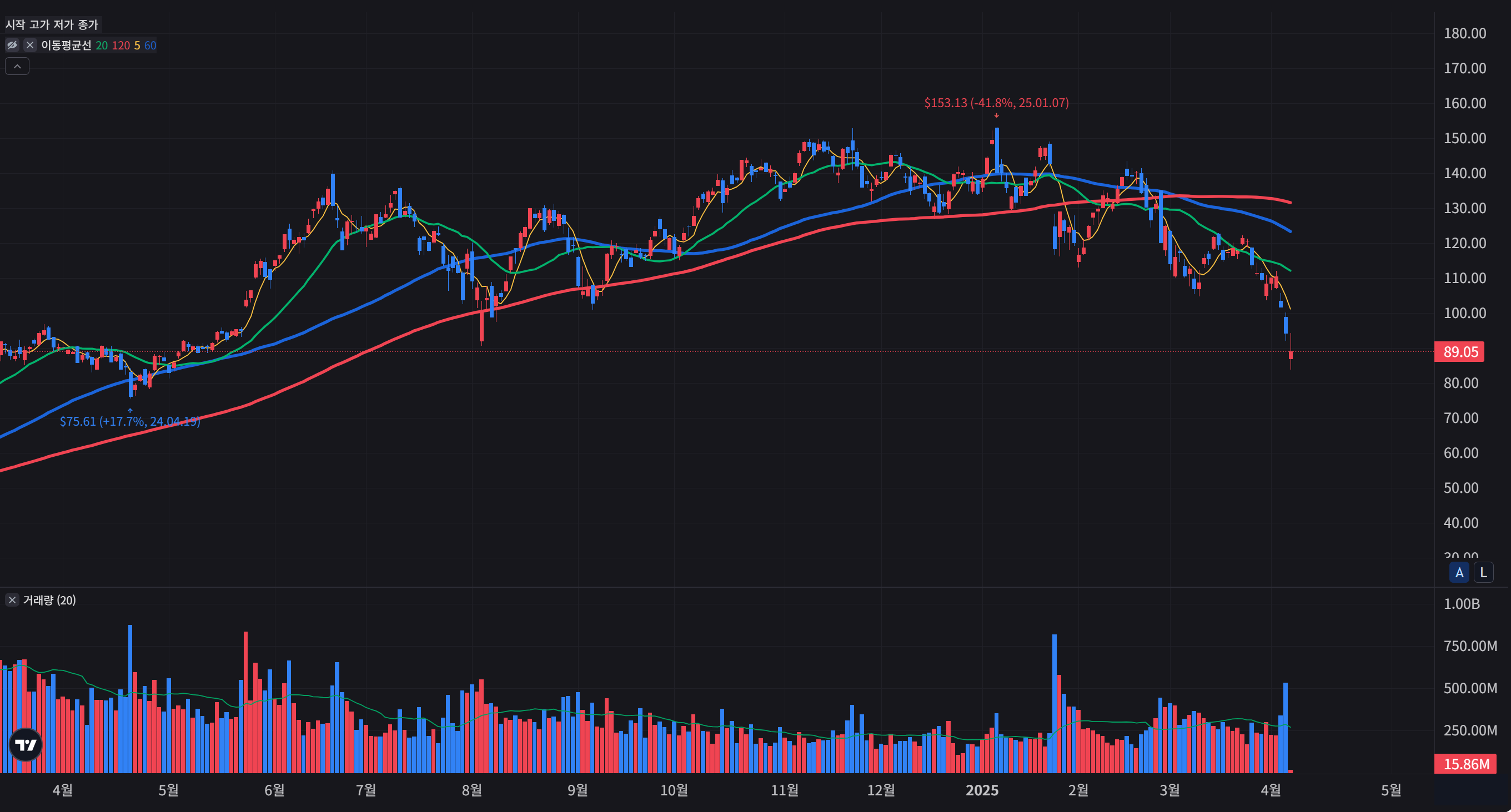 다만, 2024년 4월 저점($75.61) 근처는 강력한 지지선으로 작용할 가능성이 있으므로, 해당 가격대 접근 시 펀더멘털을 함께 고려한 매수 검토가 가능합니다. 장기 투자자의 경우 추가적인 하락 가능성에 대비해 분할 매수 전략을 고려할 수 있습니다
