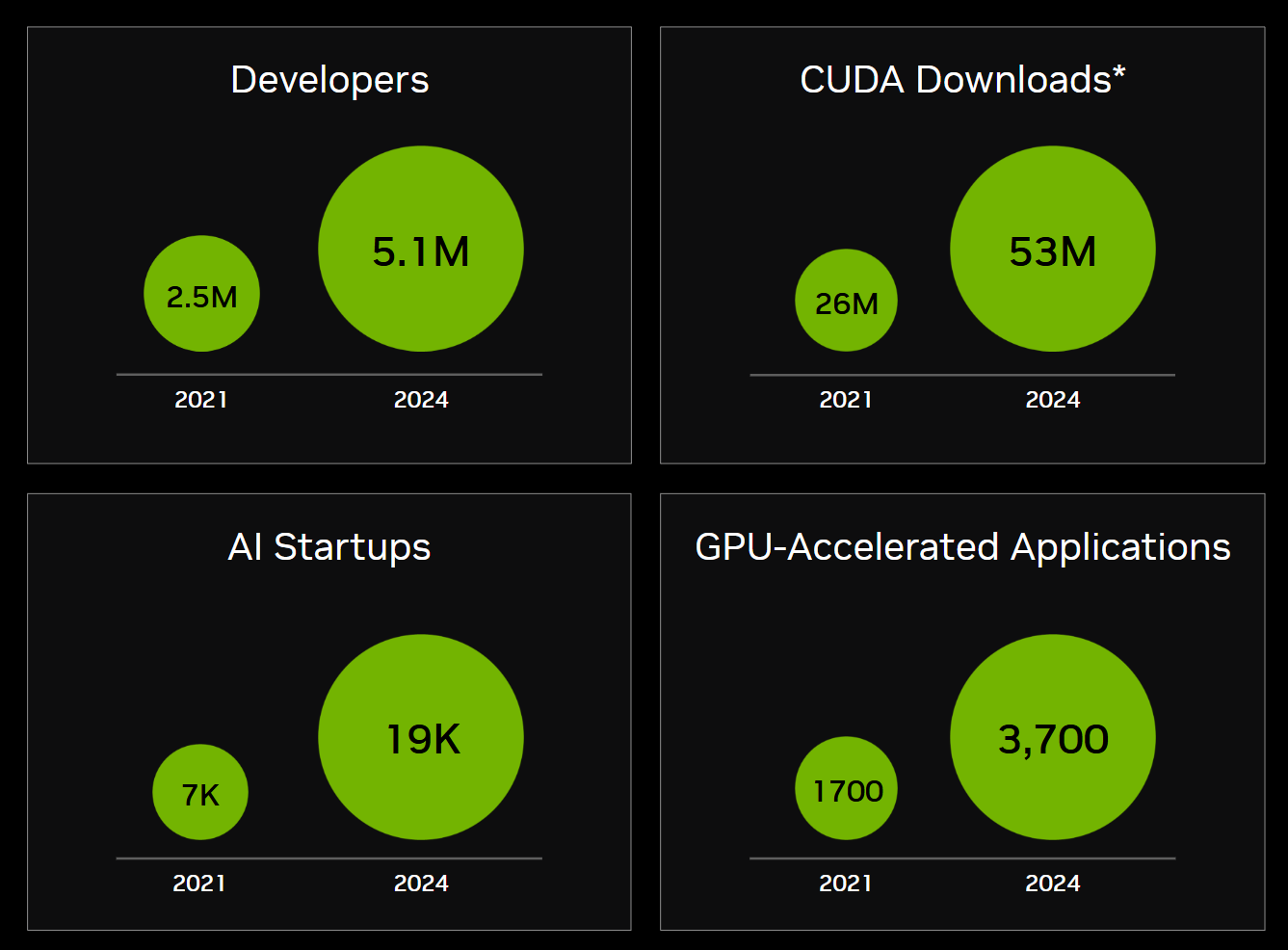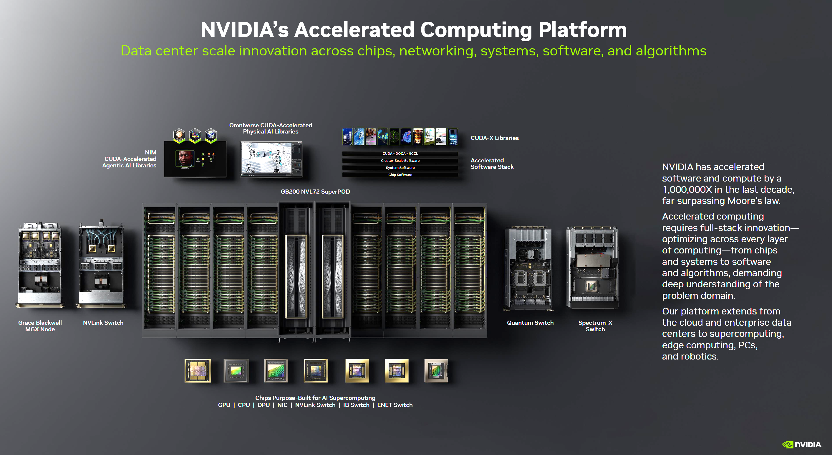 - Blackwell 아키텍처의 성공적 출시: Blackwell AI 슈퍼컴퓨터의 대규모 생산 확대로 첫 분기에 수십억 달러의 매출을 달성했습니다