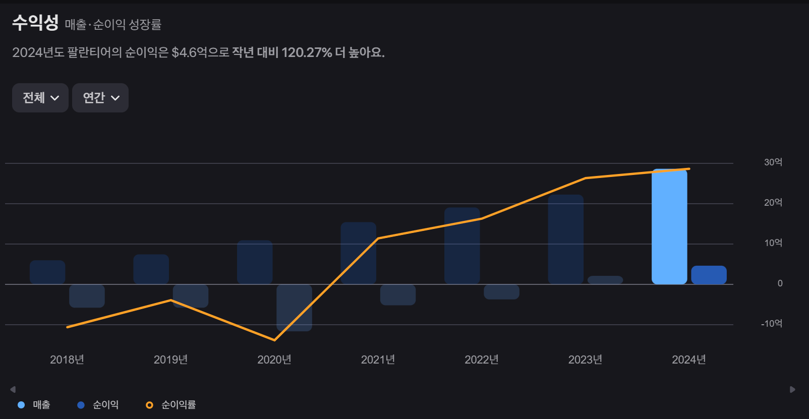 - 특히 주목할 점은 2020년부터 2022년까지 적자를 기록했으나, 2023년 흑자 전환 후 2024년에는 수익성이 크게 향상된 것입니다
