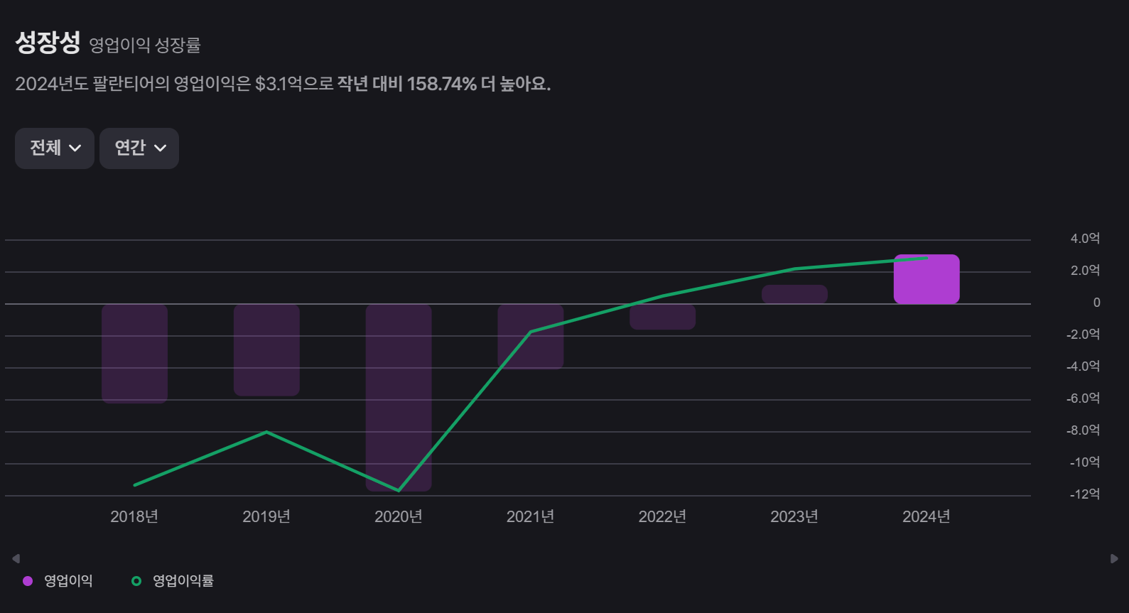 - 2024년 영업이익은 3.10억 달러로 전년(1.20억 달러) 대비 158.7% 급증했습니다