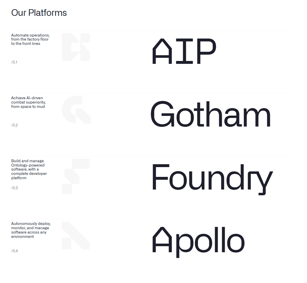 - Foundry: 상업 및 정부 고객이 데이터 운영을 간소화하고 의사결정 프로세스를 개선하는 데 사용하는 플랫폼으로, 다양한 산업 분야에 적용됩니다