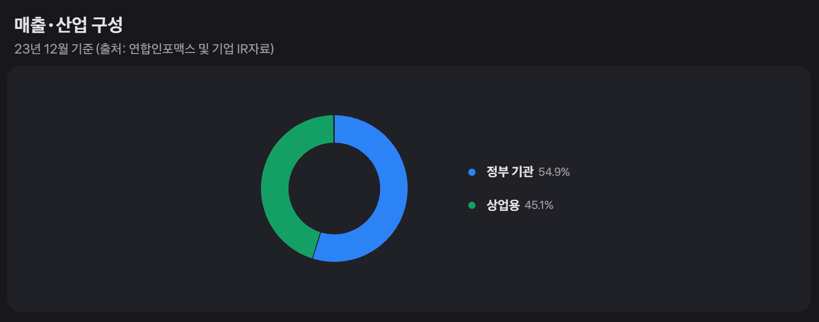 - 정부 부문: 2023년 기준 약 12억 달러의 매출을 기록하여 전체 수익의 약 54%를 차지했습니다. 미국 정부는 특히 팔란티어의 주요 수익원으로, 전체 수익의 약 50%를 차지합니다