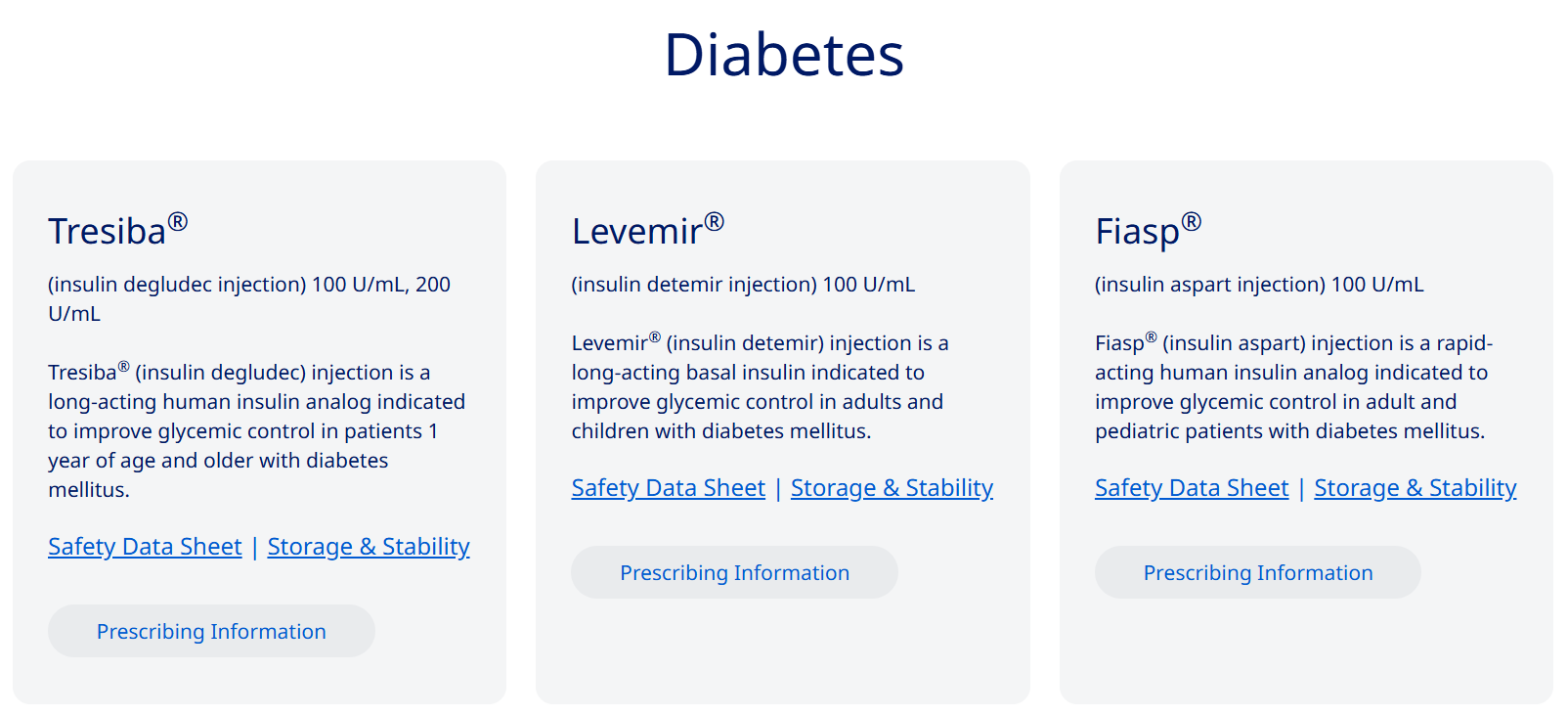 - 인슐린 제품: Tresiba(인슐린 데글루덱), Levemir(인슐린 데테미르), Fiasp(인슐린 아스파트), NovoLog(인슐린 아스파트)