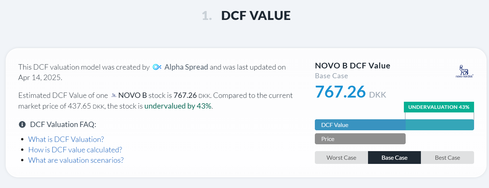- 알파스프레드(Alpha Spread): DCF 가치 767.26 DKK 산정