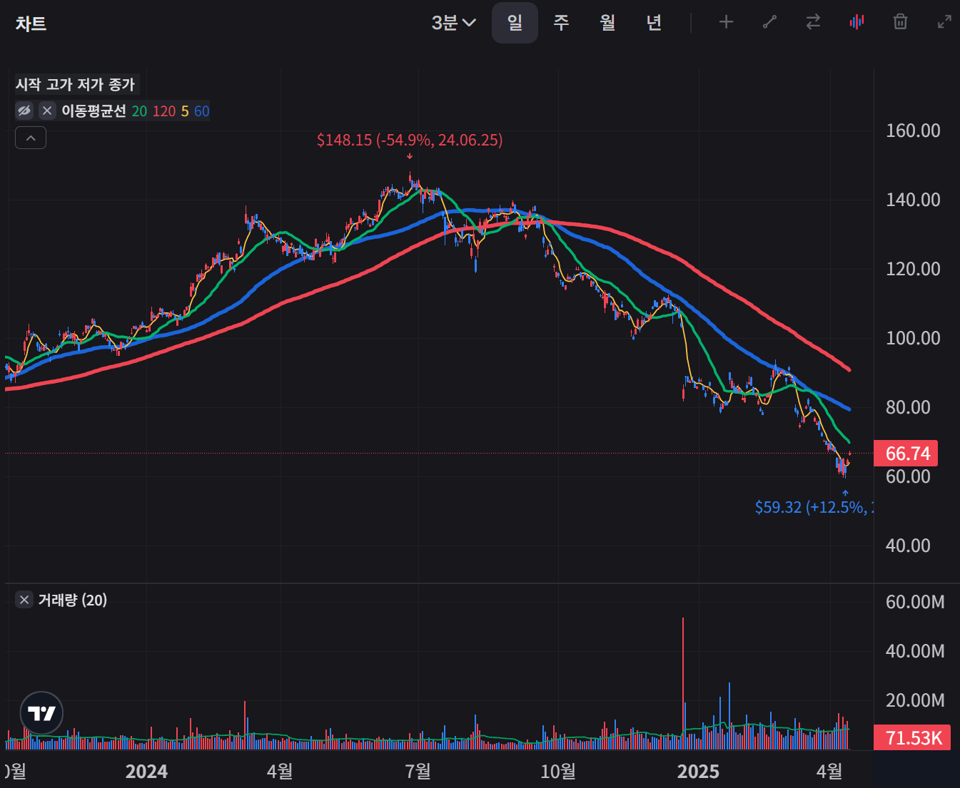- 2023년 중반부터 2024년 초까지 140-150달러 수준까지 상승했던 주가는 이후 급격한 하락세를 보이며 현재는 최고점 대비 약 55% 하락한 상태입니다