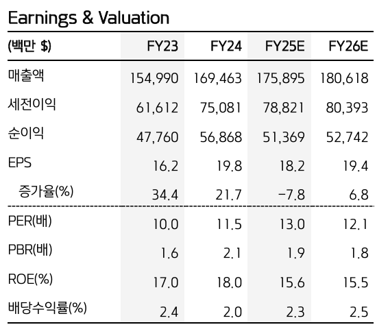- 장점: 높은 ROE(18%)와 안정적인 자본구조로 인한 리스크 대비 수익성 우수