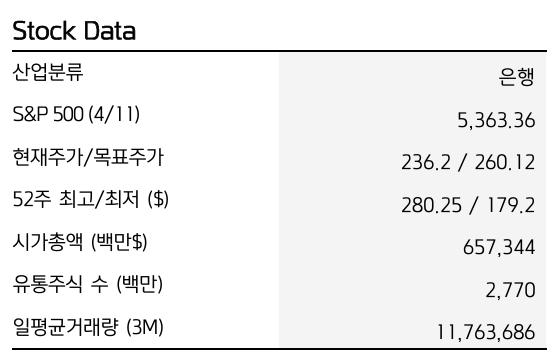제이피모간 체이스는 컨센서스를 상회하는 실적, 15%를 상회하는 높은 자본비율, 18% 수준의 ROE, 그리고 강화된 주주환원 정책을 바탕으로 불확실한 경제 환경에서도 견고한 성과를 보여주고 있습니다