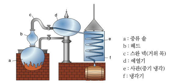 1차 증류액은 2차 증류를 하여 더욱 농축됩니다. 2차 증류 시 처음 나오는 증기는 초류라 부르는데 이 부분은 매우 휘발성이 높고 바람직하지 않은 향미를 지니므로 따로 받습니다. 가운데 증류액을 심장이라고 부르는데 이 부분이 최종적으로 음용되는 브랜디라 할 수 있습니다. 알코올 농도는 70%이며 나머지는 후류로서 따로 받습니다. 초류와 후류는 1차 증류액과 섞어 다음 2차 증류에서 증류합니다.