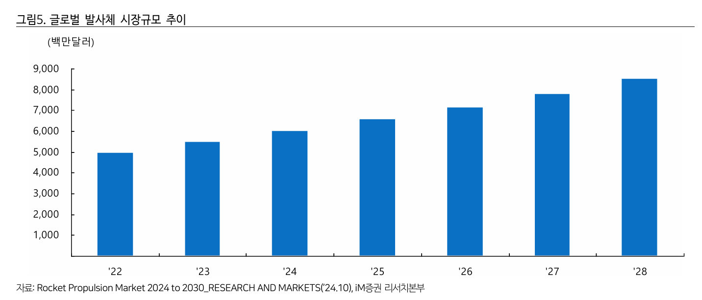 우주발사체 세계 시장은 연평균 성장률(CAGR) 9.1%로 성장하며, 2022년 약 49억 6천만 달러에서 2028년 85억 1천만 달러 규모로 확대될 전망입니다. 이는 다음과 같은 요인에 기인합니다