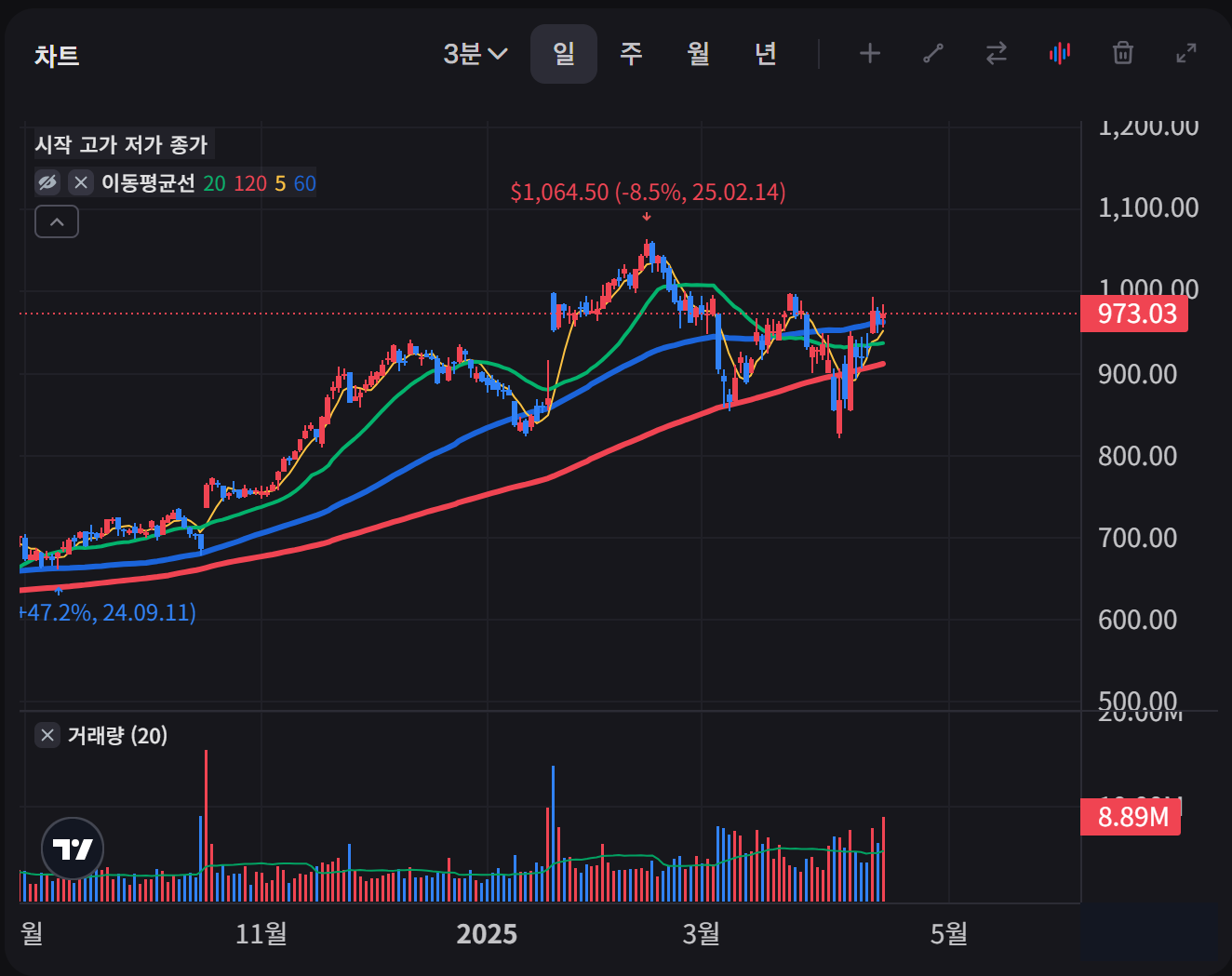 - 분할 매수 전략: 현재 가격($973.03)에서 일부 포지션을 시작하고, 주가 조정 시 추가 매수하는 방식으로 평균 매수가를 낮추는 전략