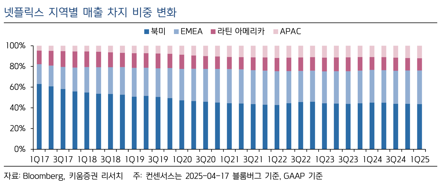 역사적으로 가정 내 엔터테인먼트 수요는 경기 불황 속에서도 견고한 모습을 보여왔습니다. 특히 관세 우려와 같은 정책적 불확실성이 높은 시기에 넷플릭스는 상대적으로 영향을 적게 받는 사업 모델을 갖추고 있습니다