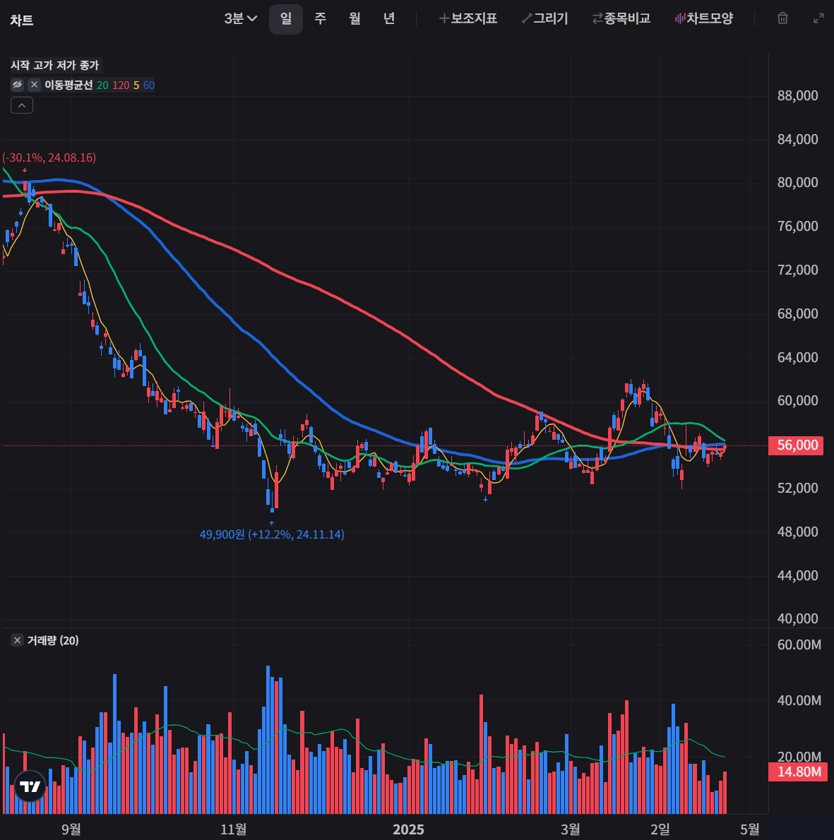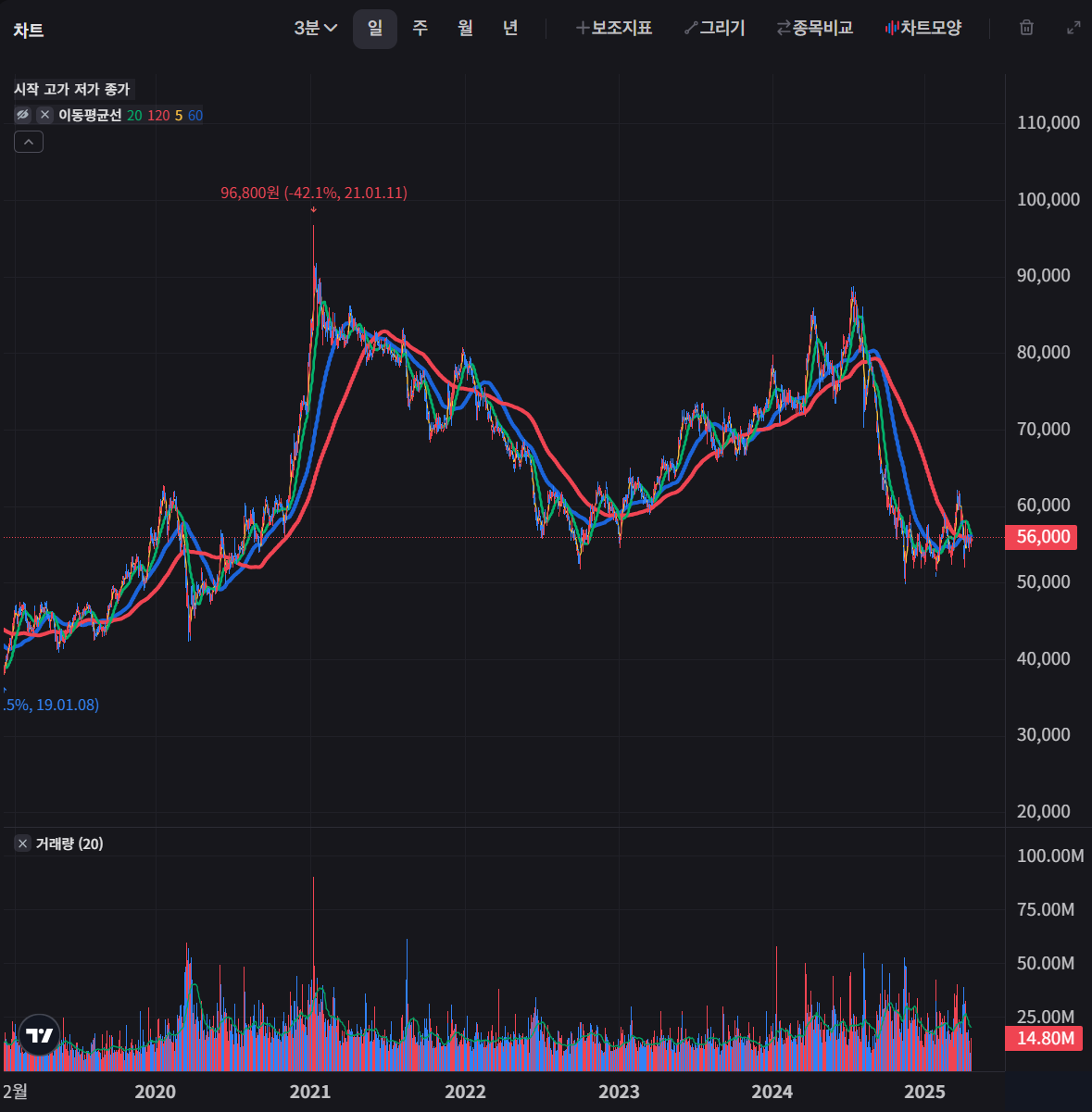 - 2021년부터 2023년까지 큰 하락 사이클을 보였고, 2023년부터 2024년까지 반등했으나 2024년 다시 하락하여 현재 56,000원 선에서 거래되고 있습니다
