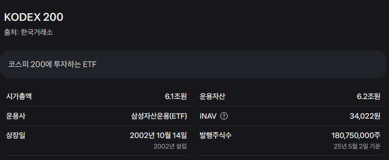 2002년 10월 14일 삼성자산운용에 의해 국내 최초의 ETF로 상장되었습니다. 삼성자산운용의 ETF 브랜드 KODEX는 한국 ETF 시장의 역사를 연 브랜드로, 2022년 기준 KODEX200의 순자산(AUM) 규모는 4조 7천843억원으로 국내 ETF 중 최대 규모를 자랑합니다