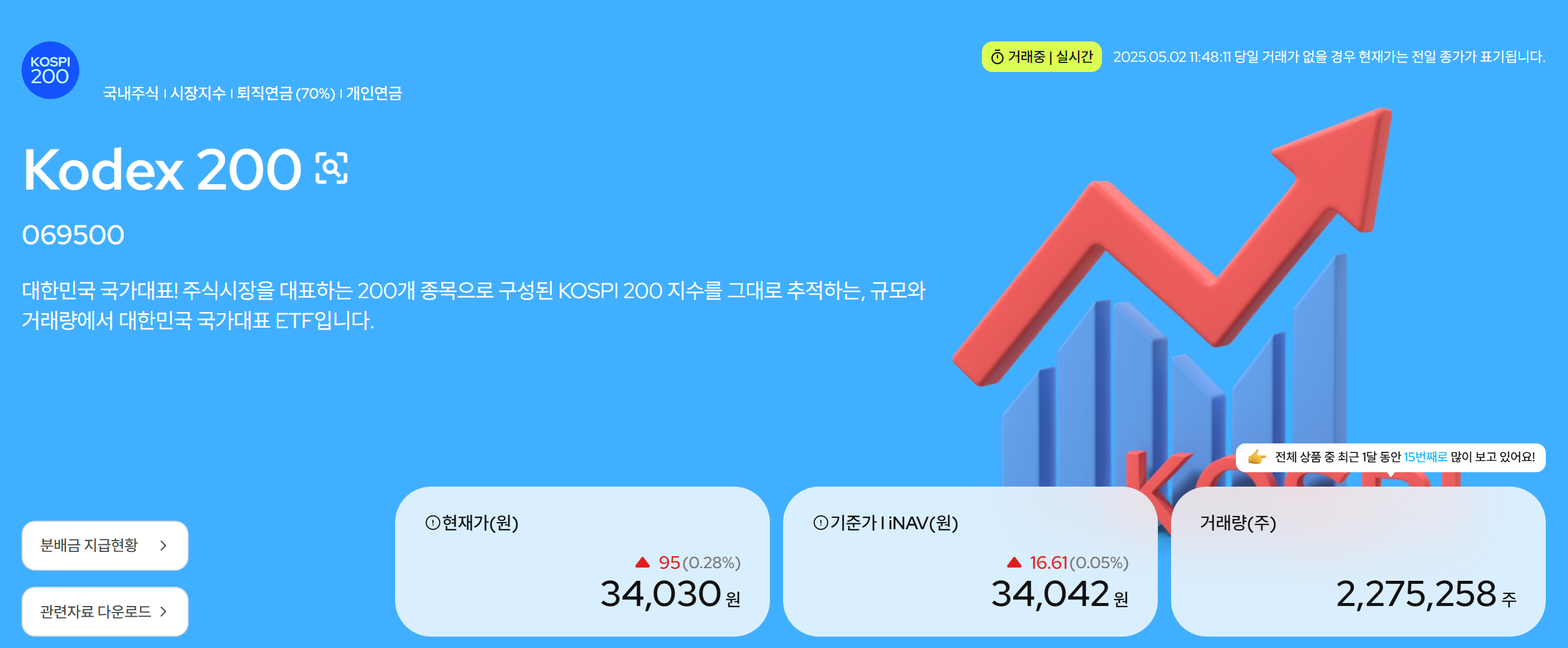 - 배당 수익: KODEX200은 구성 종목들의 배당금을 받아 분배금을 지급하므로 추가 수익을 기대할 수 있습니다
