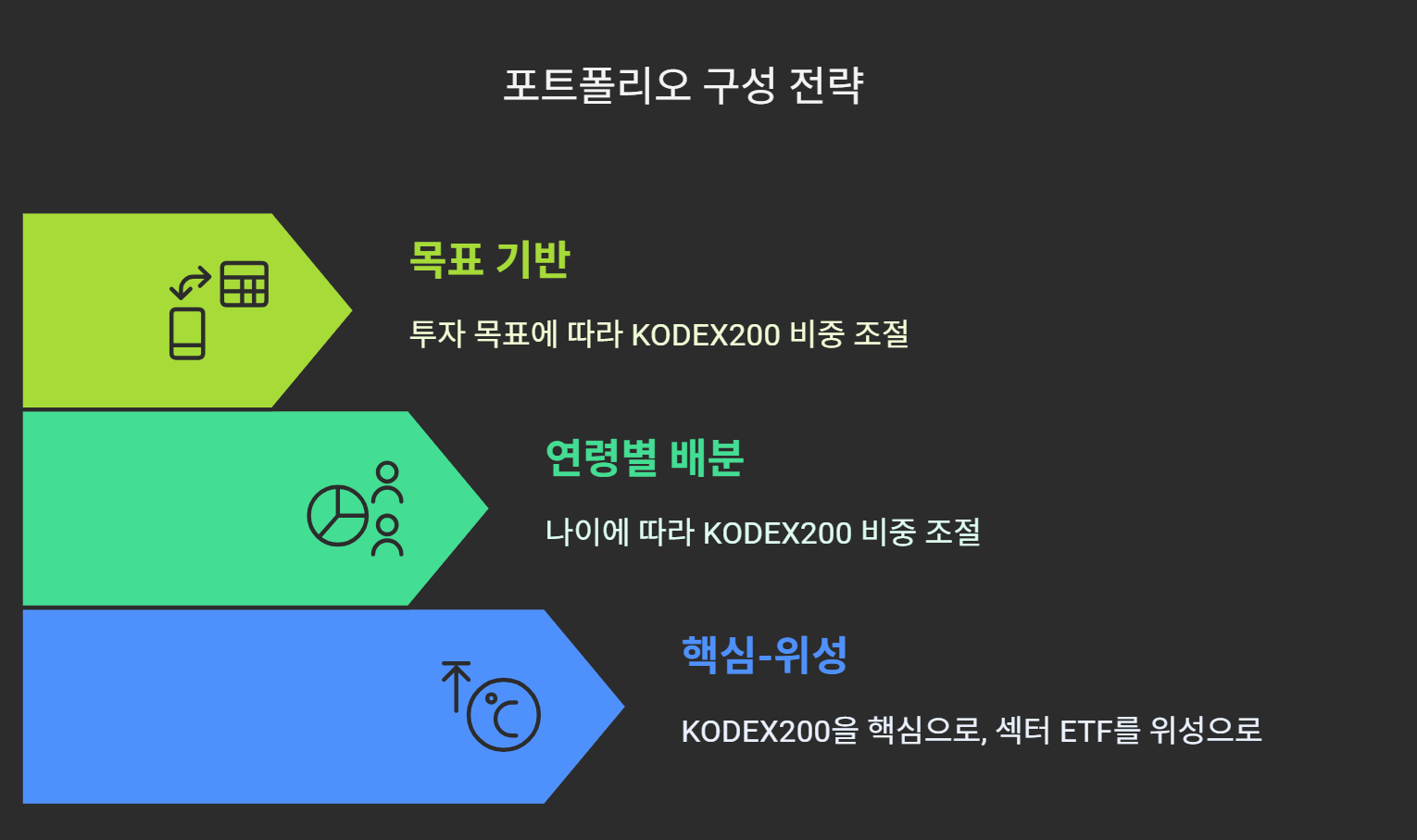 - 핵심-위성 전략: KODEX200을 포트폴리오의 핵심(60~70%)으로 두고, 나머지는 섹터 ETF나 테마 ETF와 같은 위성 투자(30~40%)로 구성하는 전략입니다.