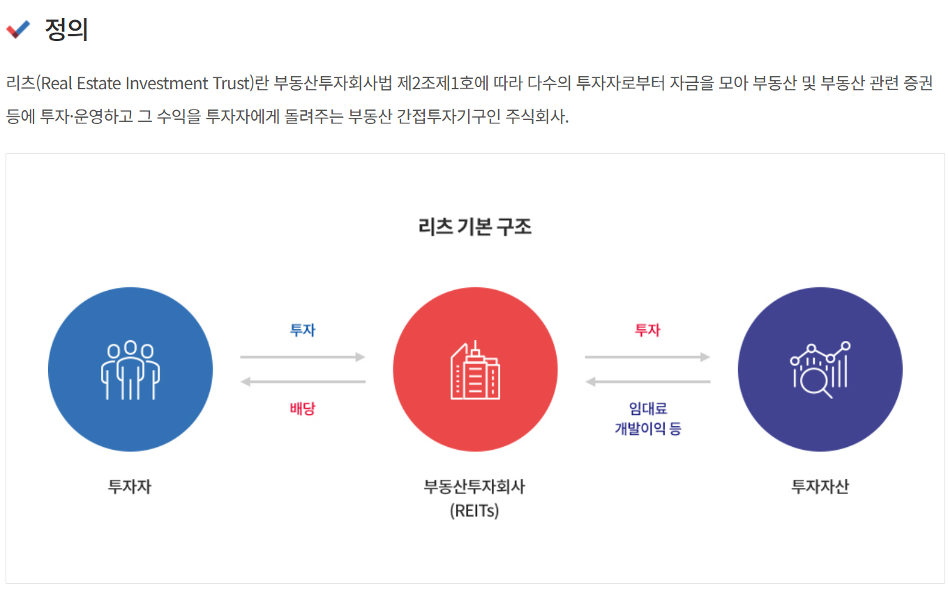리츠(REITs)는 'Real Estate Investment Trust'의 약자로, 다수의 투자자로부터 자금을 모아 부동산 및 부동산 관련 증권에 투자하고 그 수익을 투자자에게 돌려주는 부동산 투자회사입니다. 간단히 말해, 부동산에 직접 투자하지 않고도 부동산 투자 수익을 얻을 수 있는 금융상품이라고 볼 수 있습니다