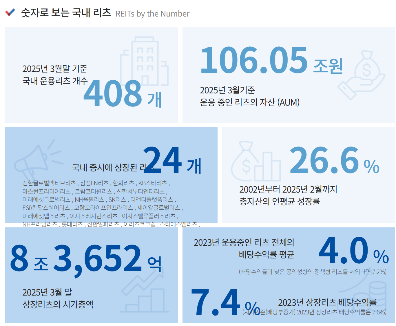 2025년 3월 기준으로 국내에는 24개의 상장 리츠가 운영 중이며, 상장 리츠의 시가총액은 8조 3,652억 원에 달합니다. 운용 중인 리츠는 총 408개로, 자산 규모는 106.05조 원에 이릅니다