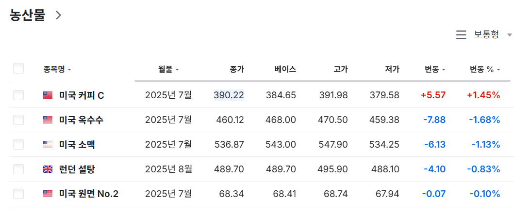 - 농산물: 콩, 옥수수, 밀, 커피 등 식량 자원으로 기후 변화와 관련된 가격 변동이 큼