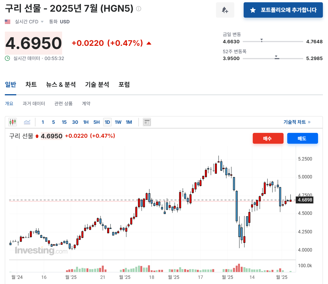 "닥터 코퍼(Doctor Copper)"라는 별칭을 가질 정도로 경제 회복의 신호를 보여주는 자산으로, 제조업, 전자제품, 건설업에 필수적인 산업용 금속입니다