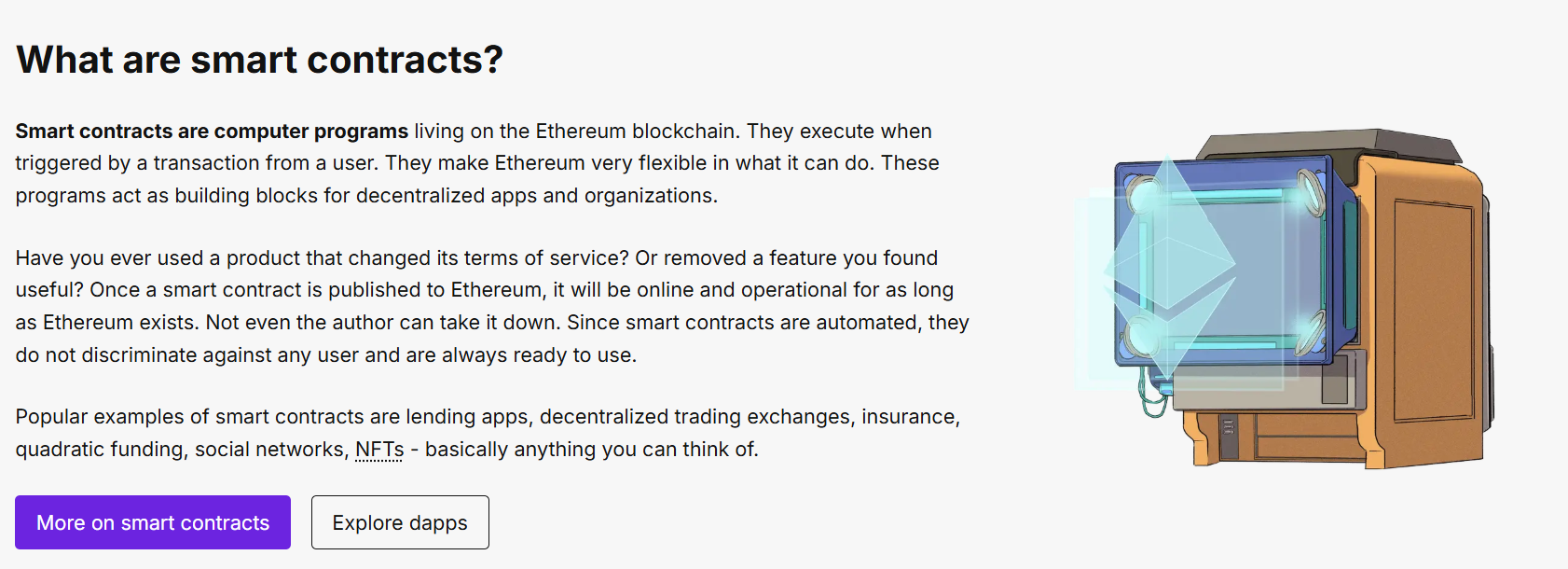 이더리움에서 스마트 컨트랙트는 솔리디티(Solidity)라는 코딩 언어로 작성됩니다. 이것은 돈을 빌리거나, 디지털 아트를 거래하거나, 심지어 그룹에서 투표하는 앱 등 다양한 앱을 구동합니다