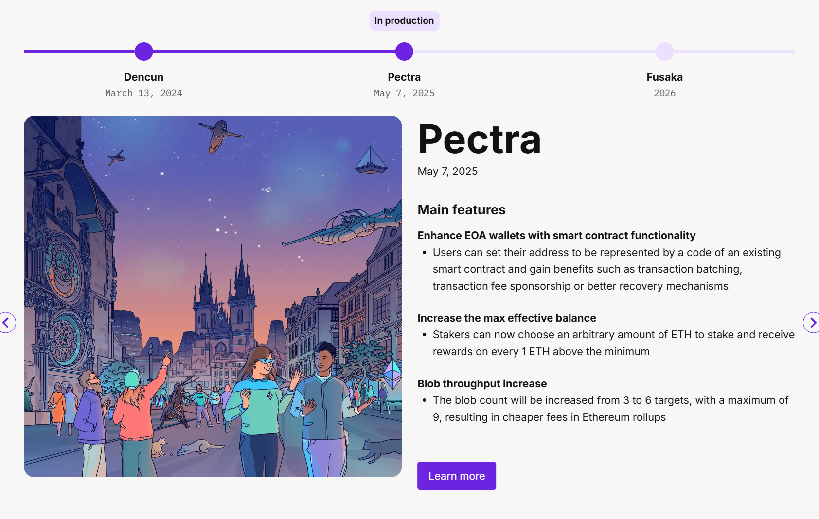 2025년 5월 7일에 출시된 펙트라 업그레이드는 이더리움 2.0에 도입된 기반 변화를 바탕으로 한 이더리움의 진화에서 다음 주요 단계를 나타냅니다. 펙트라는 네트워크 확장성, 사용자 경험 및 스테이킹 효율성 개선에 중점을 둔 단일 종합 업데이트로 이전에 계획된 두 업그레이드(프라하-실행 레이어와 일렉트라-합의 레이어)를 결합합니다