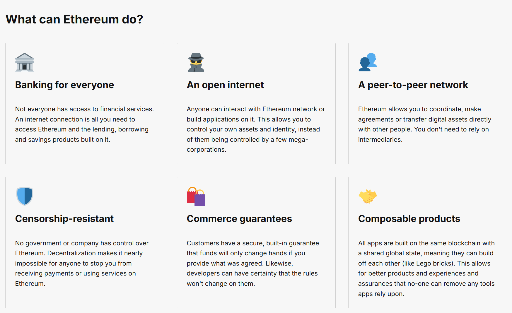 간단히 설명하자면 스마트폰의 앱스토어와 비슷합니다. 다양한 앱을 다운로드해 여러 기능을 활용할 수 있는 앱스토어처럼, 이더리움은 웹을 위한 "앱스토어"로 기능하며 자체 디지털 화폐인 이더(ETH)로 구동됩니다