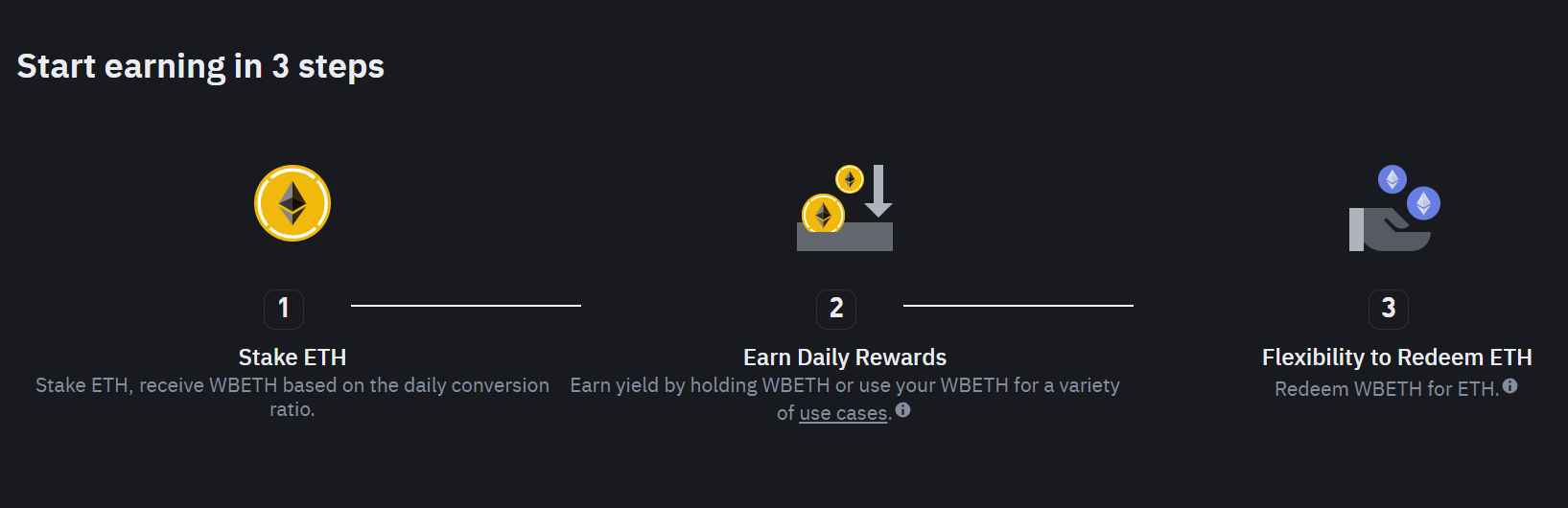 거래소 스테이킹: 일부 암호화폐 거래소는 스테이킹 서비스를 제공하여 기술적인 부분을 직접 처리하지 않고도 스테이킹할 수 있는 가장 쉬운 방법을 제공합니다[2]. 이 방법은 "서비스로서의 스테이킹"이라고도 합니다. 예를 들어, 바이낸스 ETH 스테이킹으로 일일 보상을 받을 수 있습니다