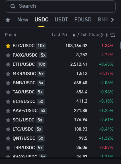 - 오른쪽에는 거래 쌍 목록이 있습니다. Binance에서 사용 가능한 모든 거래 쌍을 포함합니다. 검색 기능을 사용하여 특정 쌍을 찾을 수 있습니다