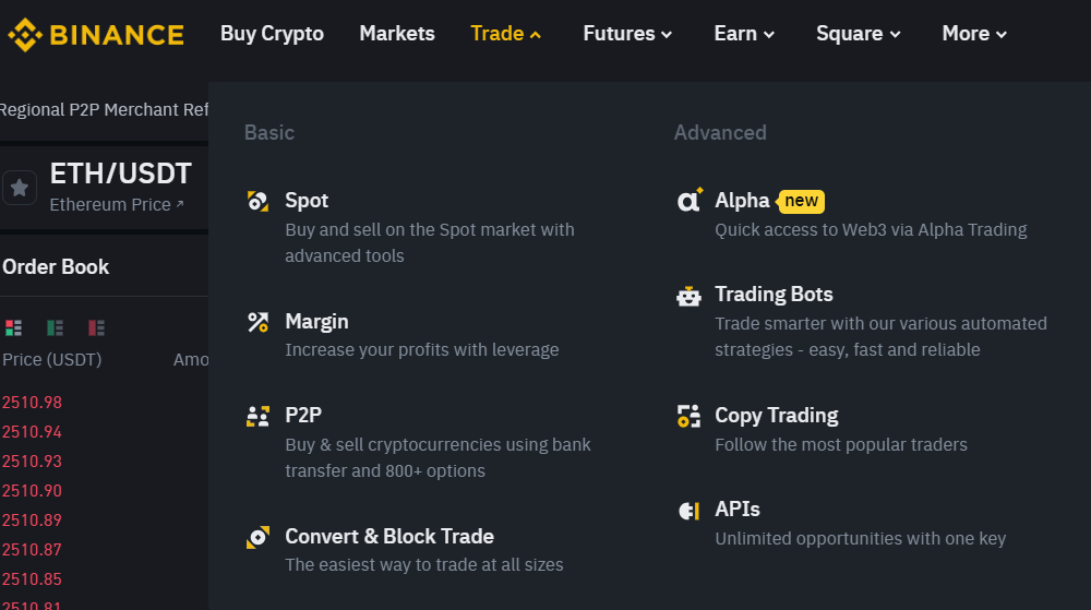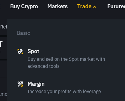 - Binance 계정에 로그인하고 [Trade] → [Spot]을 찾으세요.