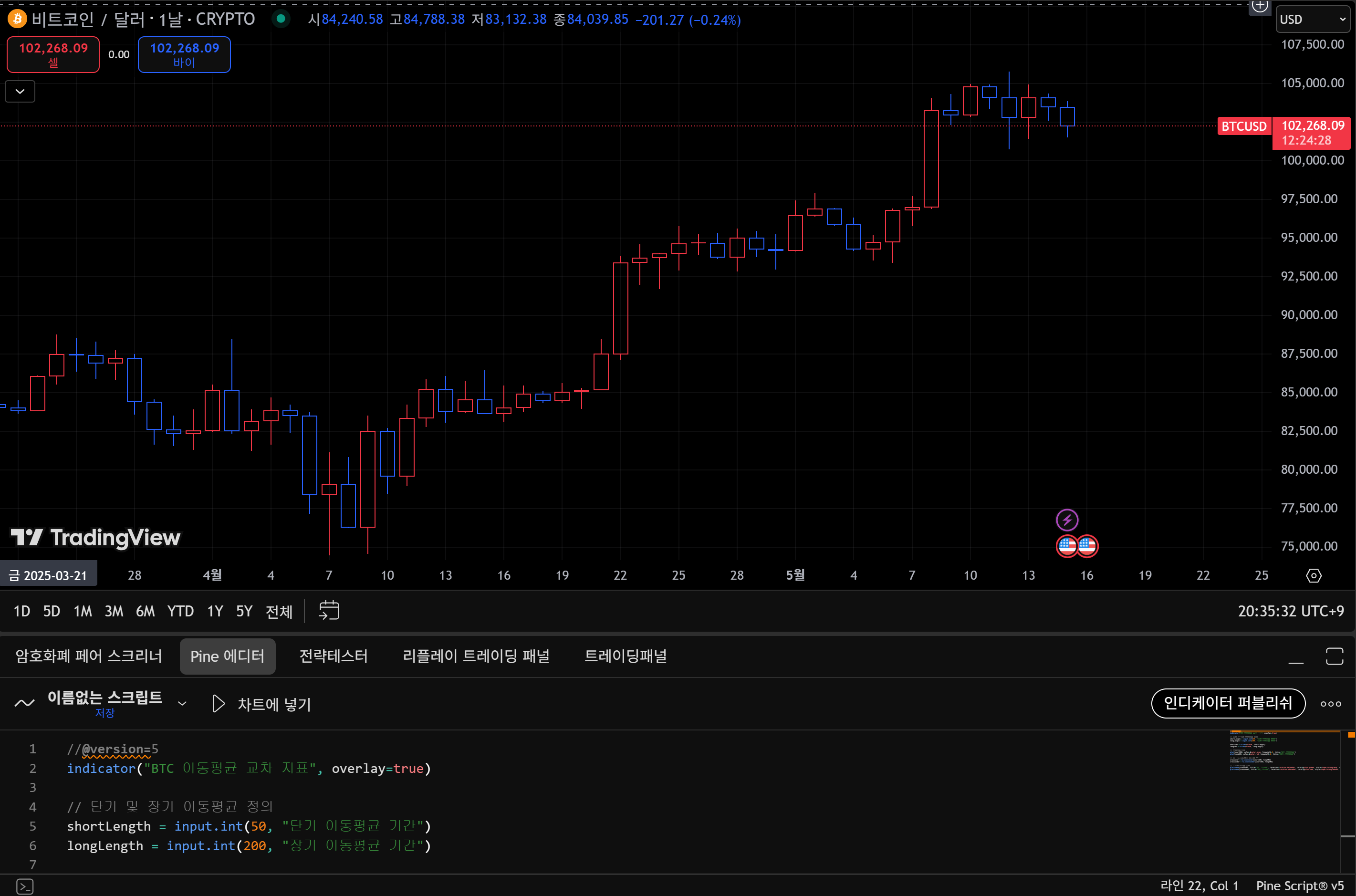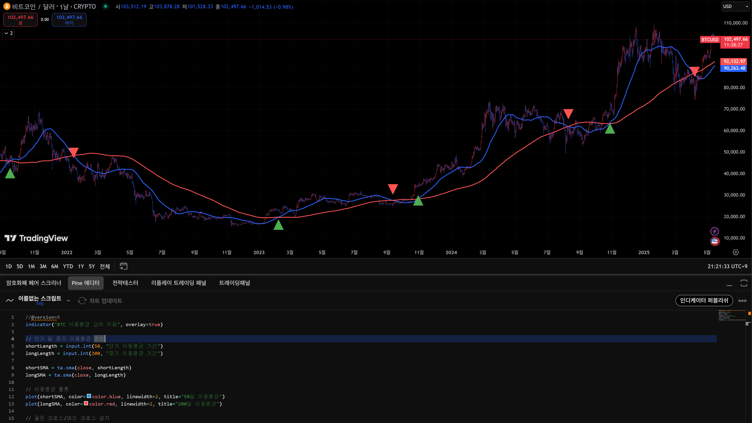이 스크립트는 BTCUSD 차트에서 50일과 200일 이동평균선을 표시하고, 골든 크로스(단기 이동평균이 장기 이동평균을 상향 돌파)와 데드 크로스(단기 이동평균이 장기 이동평균을 하향 돌파)를 시각적으로 표시합니다