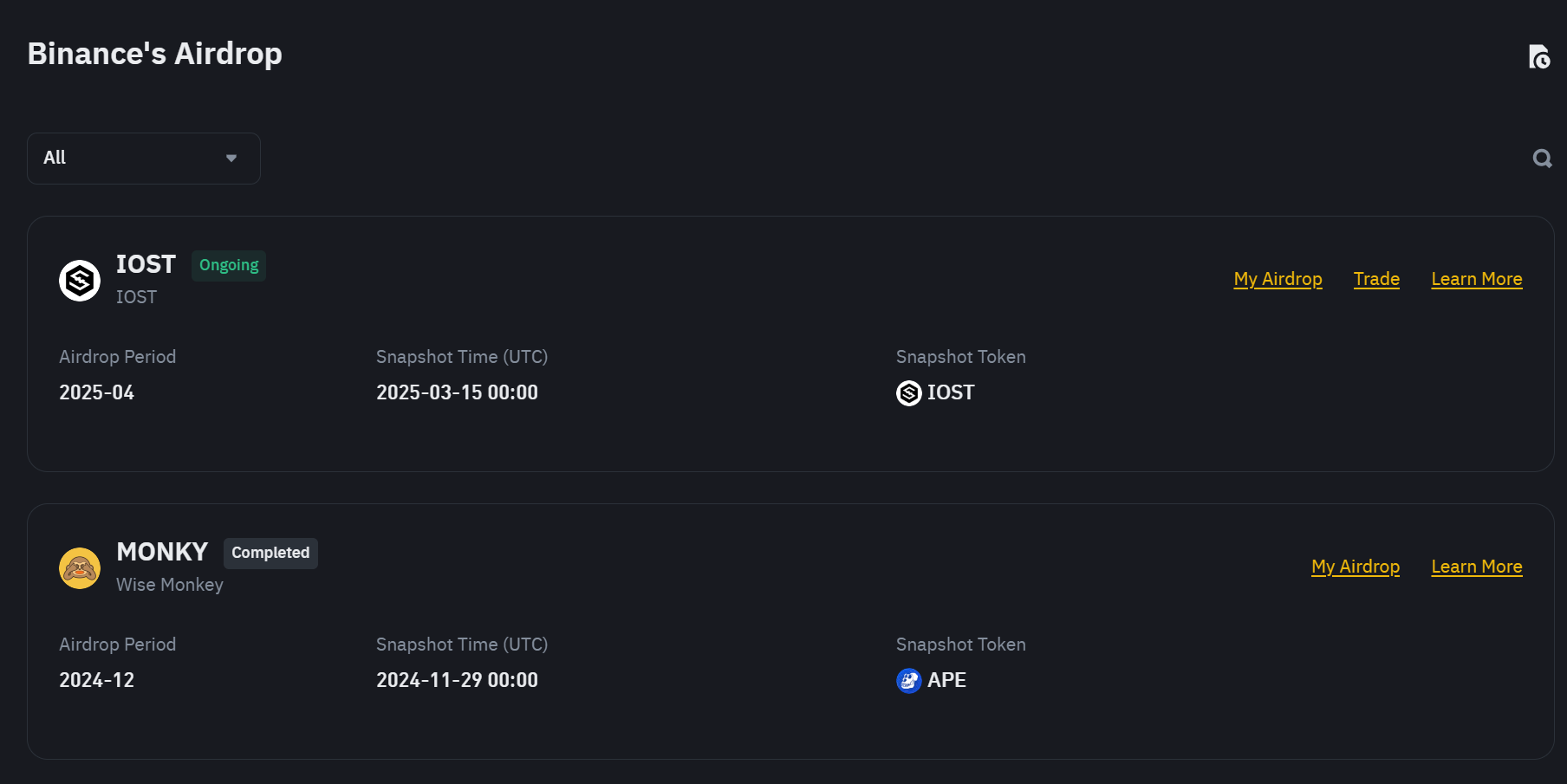 - 에어드롭 완료 후, 토큰은 사용자의 바이낸스 현물(Spot) 지갑으로 자동 입금됩니다